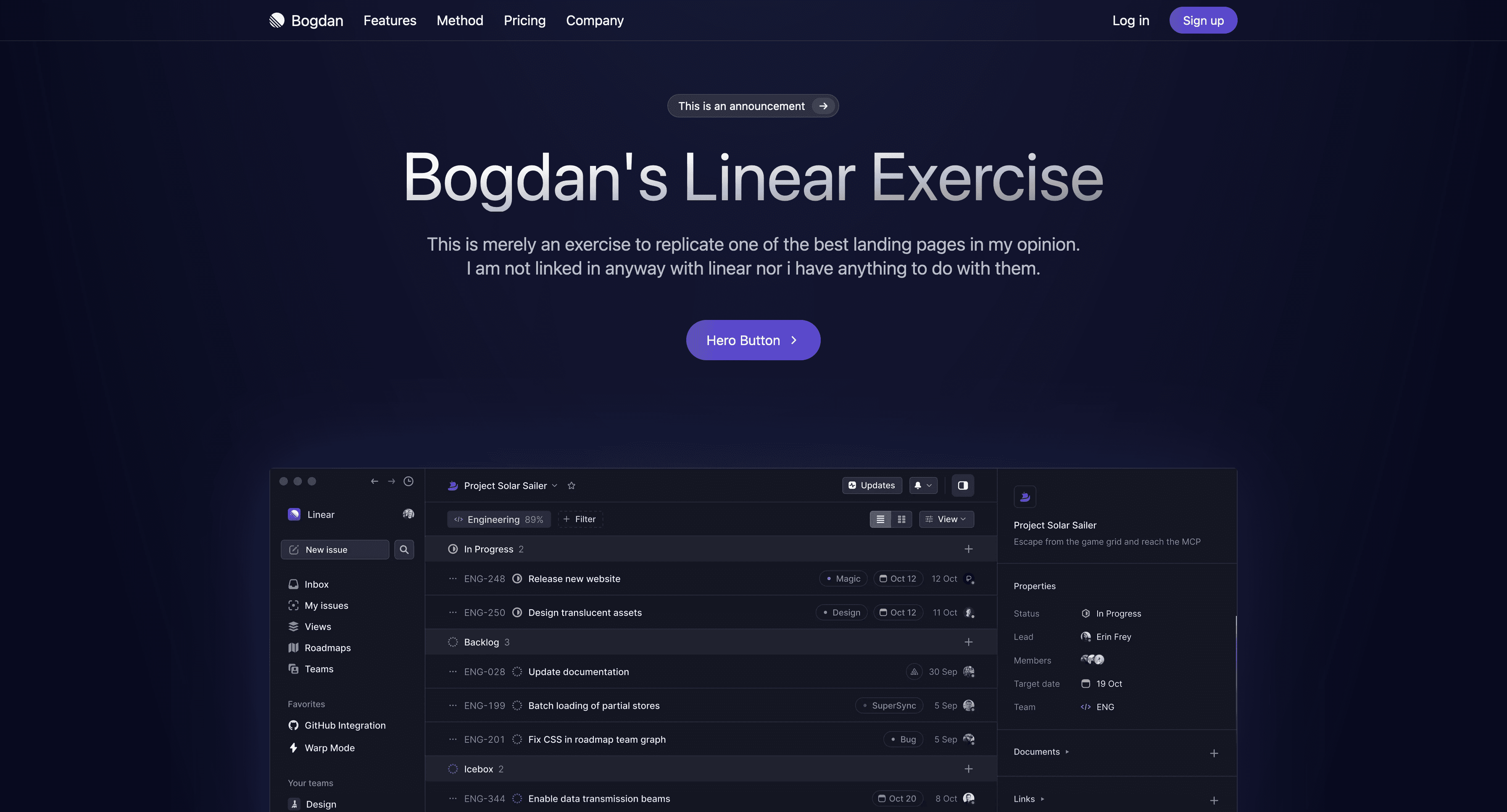 Descomponer la página de inicio de Linear.app en componentes reutilizables fue crucial. Desde la sección de héroe hasta los aspectos más destacados de las funciones, cada componente fue meticulosamente elaborado para reflejar el diseño original.